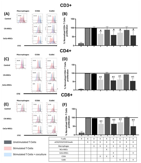 Macrophages from cocultures with TCs/NCx-MSCs did not decrease T cell proliferation. To evaluate the ability of macrophages to decrease T lymphocyte proliferation, macrophages obtained from cocultures of TCs/MSCs/monocytes were cultured with CFSE-labeled CD3+ T lymphocytes, which were quantified by flow cytometry. Representative histogram plots of the percentage proliferation of CD3+ (A), CD4+ (C), and CD8+ T lymphocytes (E). Bar graphs of the percentage proliferation of CD3+ (B), CD4+ (D), and CD8+ T lymphocytes (F). Bar graphs represent the means with standard errors (n = 5). The black line indicates the control to compare the percentage of proliferation. The Kruskal–Wallis test followed by the Mann–Whitney U post hoc test was conducted. * Significant difference with respect to the control. ° Significant difference with respect to NCx-MSCs. *, ° Significant difference, p < 0.05. TCs: tumor cells; C33A and CaSKi: cervical cancer cell lines; NCx-MSCs: normal cervix-derived mesenchymal stromal cells; CeCa-MSCs: cervical-cancer-derived mesenchymal stem cells; CFSE: carboxyflurescein succinimidyl.