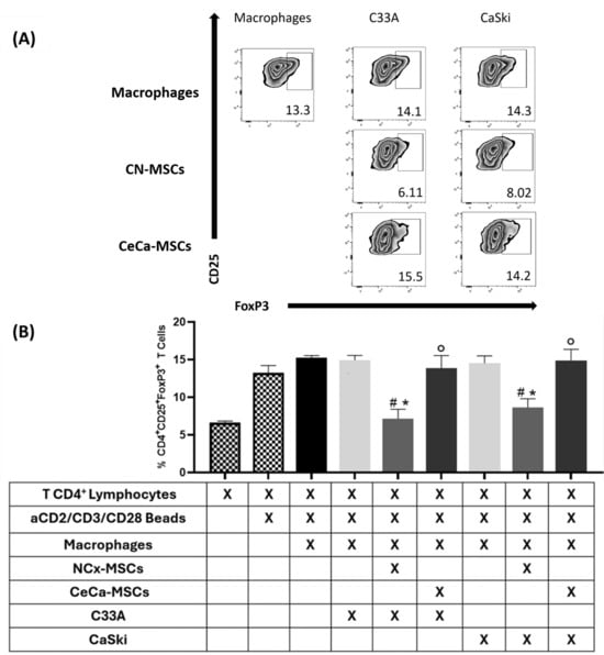 Macrophages from cocultures with TCs/NCx-MSCs lowered their capacity to generate regulatory T lymphocytes. To determine the capacity of macrophages to generate regulatory T lymphocytes, macrophages obtained from cocultures of TCs/MSCs/monocytes were cultured with CD4+ T lymphocytes, and the expression of CD25 and intracellular FOXP3 in lymphocytes was quantified by flow cytometry. (A) Zebra plots representative of the percentage of CD4+CD25+FOXP3+ regulatory T lymphocytes. (B) Bar graphs of the percentage of CD4+CD25+FOXP3+ regulatory T lymphocytes. Bar graphs represent the means with standard deviations (n = 5). The Kruskal–Wallis test followed by the Mann–Whitney U post hoc test was conducted. * Significant difference with respect to macrophage control. # Significant difference with respect to tumor line. ° Significant difference with respect to NCx-MSCs. *, #, ° Significant difference, p < 0.05. TCs: tumor cells; C33A and CaSKi: cervical cancer cell lines; NCx-MSCs: normal cervix-derived mesenchymal stromal cells; CeCa-MSCs: cervical-cancer-derived mesenchymal stem cells.