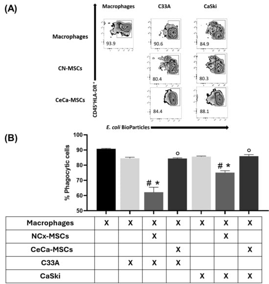 Macrophages from cocultures with TCs/NCx-MSCs decreased their phagocytic capacity. To determine the phagocytic capacity of macrophages, the macrophages obtained from cocultures of TCs/MSCs/monocytes were cultured with TCs/MSCs and labeled with pH Rodo Green E. coli BioParticles Conjugate. The percentage of phagocytic cells was determined by flow cytometry. (A) Zebra plots representative of the percentage of phagocytic macrophages. (B) Bar graphs of the percentage of macrophages with phagocytic capacity. Bar graphs represent the means with standard errors (n = 5). The Kruskal–Wallis test followed by the Mann–Whitney U post hoc test was conducted. * Significant difference with respect to the control. # Significant difference with respect to tumor line. ° Significant difference with respect to NCx-MSCs. *, #, ° Significant difference, p < 0.05. TCs: tumor cells; C33A and CaSKi: cervical cancer cell lines; NCx-MSCs: normal cervix-derived mesenchymal stromal cells; CeCa-MSCs: cervical-cancer-derived mesenchymal stem cells.
