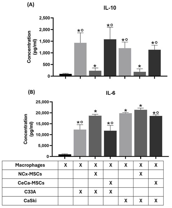 Macrophages cocultured with TCs/NCx-MSCs decreased the soluble IL-10 concentration and increased the soluble IL-6 concentration. To determine the concentration of IL-10 and IL-6 secreted into the medium, the supernatants of TC/MSC/monocyte cocultures were analyzed using a panel kit cytometry bead, and the concentration of interleukins was quantified by flow cytometry. Bar graphs of the concentration (pg/mL) of soluble IL-10 (A) and soluble IL-6 (B) in the supernatant of the indicated cultures. Bar graphs represent the means with standard errors (n = 5). The Kruskal–Wallis test followed by the Mann–Whitney U post hoc test was conducted. * Significant difference with respect to the control. ° Significant difference with respect to NCx-MSCs. *, ° Significant difference, p < 0.05. TCs: tumor cells; C33A and CaSKi: cervical cancer cell lines; NCx-MSCs: normal cervix-derived mesenchymal stromal cells; CeCa-MSCs: cervical-cancer-derived mesenchymal stem cells.