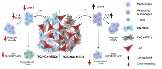 Coculture of TCs/CeCa-MSCs promote higher in vitro M2 polarization of macrophages than coculture of TCs/NCx-MSCs. Schematic diagram of the in vitro mechanism of macrophage polarization towards the M2 phenotype mediated by the cocultures of TCs/NCx-CeCa and TCs/CeCa-MSCs, in terms of the modification of surface markers, intracellular molecules, phagocytosis capacities, and generation of Tregs lymphocytes, as well as the decrease in the proliferation of T lymphocytes by macrophages. The diagram shows the presence of cytokines in the supernatant that could play a role in macrophage polarization. Created in BioRender. Bautista, E. (2025). https://BioRender.com/3r6wzlj (accessed on 20 June 2024).