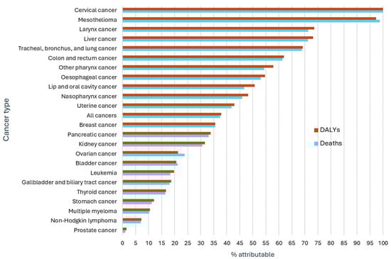 For our study on cancer burden attributable to risk factors in Australia in 2021, results were extracted and compiled from the GBD Compare (https://vizhub.healthdata.org/gbd-compare/cancer) and Global Health Exchange websites (https://ghdx.healthdata.org/) accessed on 13 January 2025. Our outcomes of interest were cancer deaths and DALYs lost. One DALY represents one year of “healthy life” lost due to illness/disability and/or premature death [21]. From the GBD database, we extracted data for causes identified as “neoplasms”, measurements of “death” and “DALY”, and location specified as “Australia”, with metrics including “number”, “percent”, and “rate”. “Risk factors” included all GBD risk factors (explored at both level 1 to understand the role of the three major GBD risk classifications, and levels 2 and 3 for detailed insights into specific risks). The three GBD level-1 risk categories are behavioral, metabolic, and environmental/occupational risks. Behavioral risks include tobacco (smoking, second-hand smoke and chewing tobacco), dietary risks (diet high in processed meat, diet high in red meat, diet high in sodium, diet low in calcium, diet low in fiber, diet low in fruit, diet low in milk, diet low in vegetables, diet low in whole grains), high alcohol use, drug use, physical inactivity, and unsafe sex. Metabolic risks include high body mass index (BMI) and high fasting plasma glucose. Environmental/occupational risks include occupational carcinogens, particulate matter pollution, and residential radon. Overall, 23 specific cancer types (and all cancers combined) and 27 risks (all risks combined, 3 GBD level-1 risks, 8 GBD level-2 risks, and 15 GBD level-3 risks) were included (Table 1).