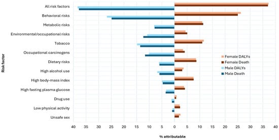 Our results highlighted notable sex-specific differences in the cancer deaths and DALYs lost attributed to risk factors, with the overall burden being greater for males. Some risk factors also affected one sex more significantly than the other and varied by cancer site. For example, the smoking- and alcohol-attributable burden of lung, liver, and laryngeal cancers was higher in males, while high BMI contributed more to the cancer burden in females. Previous evidence showed that the burden of smoking [7,9,10,16] and alcohol consumption is often higher in men [9], while high BMI contributes to cancer burden slightly more in women [6,10], especially in postmenopausal women [5]. Although some of these disparities may be related to physiological and/or lifestyle differences [43,44], the findings underscore the need to examine cancer control efforts through a gendered lens. Prevention strategies targeting men that challenge social norms have the potential to reduce cancer burden [45].