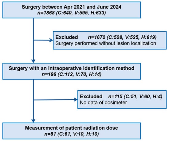 Flowchart of patient enrolment. We collected data on all surgeries requiring an intraoperative identification method at three institutions from April 2021 to June 2024. C: cone-beam computed tomography, V: virtual-assisted lung mapping, H: hook-wire.