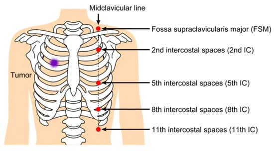 Five wearable dosimeters are placed on the patients’ bodies. These dosimeters are attached to the middle axillary line opposite the target. FSM: fossa supraclavicularis major, IC: intercostal spaces.