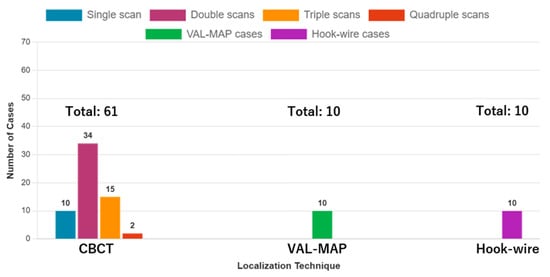 The patient characteristics are summarized in Table 2. The patients’ mean age was 64.1 (±12.7) years, and 47 (57.3%) of them were men. The marking methods included CBCT (n = 61, 75.3%), VAL-MAP (n = 10, 12.3%), and hook-wire (n = 10, 12.3%). For CBCT, there were 10 cases with a single scan (16.4%), 34 with double scans (55.7%), 15 with triple scans (24.6%), and 2 with quadruple scans (3.3%); there was no case with more than five scans (Figure 3). There were 66 cases with a single lesion (81.5%), 10 with double lesions (12.3%), 3 with triple lesions (3.7%), and 2 with more than four lesions (2.5%). Of the two cases that required quadruple CBCT scans, one involved multiple lesions (three lesions), while the other had a solitary lesion. The surgical procedures included single-wedge resection (n = 62, 76.5%), bi-wedge resection (n = 8, 9.88%), segmentectomy (n = 6, 7.41%), lobectomy (n = 4, 4.94%), and lobectomy combined with wedge resection (n = 1, 1.23%). In all four cases that underwent lobectomy, an initial wedge resection was performed, and intraoperative frozen section diagnosis confirmed primary lung cancer, prompting the subsequent lobectomy. The mean values of tumor and invasive sizes preoperatively were 12.8 (±6.12) mm and 9.28 (±7.16) mm, respectively, and 12.8 (±6.75) mm and 9.54 (±7.10) mm on pathological examination. On pathological diagnosis, there were 42 cases of primary lung cancer (51.9%) and 23 cases of metastatic tumors (28.4%). All three groups achieved a lesion resection rate of 100%.
