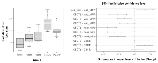 Prior to analysis, normality was assessed using Shapiro–Wilk tests for each group: VAL-MAP (W = 0.848, p = 0.055), hook-wire (W = 0.943, p = 0.585), single-scan CBCT (W = 0.938, p = 0.531), double-scan CBCT (W = 0.978, p = 0.723), and triple-scan CBCT (W = 0.867, p = 0.031). While most groups showed approximate normality, the triple-scan CBCT group deviated significantly from normality. Homogeneity of variances was assessed using Levene’s test, which indicated equal variances across groups (F = 0.795, p = 0.532). Given the mixed normality results, data were log-transformed prior to analysis.