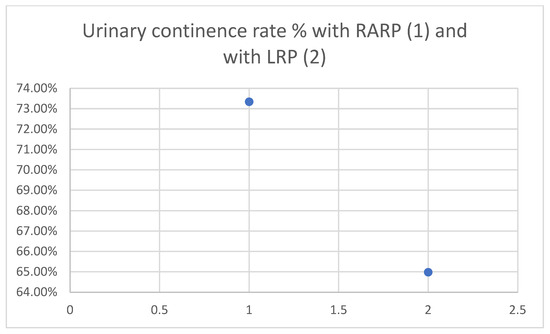 RARP is associated with improved urinary continence outcomes. As shown in Figure 1, a national retrospective study reported better urinary function scores for RARP compared to LRP (mean EPIC score: 73.34 vs. 64.98; p = 0.002), with a higher proportion of patients achieving continence [8].