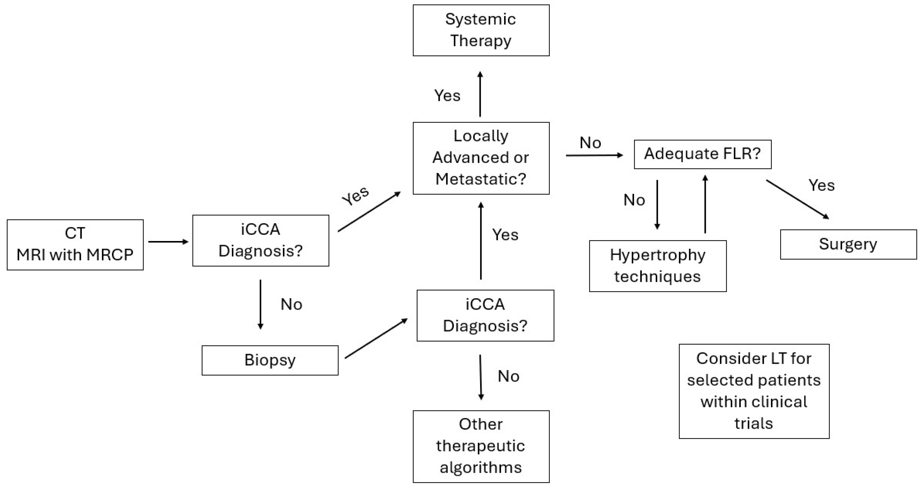 LIRICA | NCT06098547 | Prospective, Exploratory, Single-arm | Unresectable, histologically confirmed iCCA; Stable or partial response after ≥6 months of chemotherapy; No extrahepatic or nodal disease | Gemcitabine + Cisplatin ≥ 6 months; PET-MRI; Staging laparotomy with lymphadenectomy | Deceased or living donor | 3-year and 5-year OS; DFS; Recurrence; Morbidity; QoL. | Ongoing Estimated end: 2028 |
