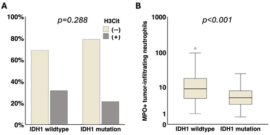 Association of IDH1 status with presence of NETs in brain tumor vessels and tumor-infiltrating neutrophils. (A) No significant association of H3Cit in brain tumor vessels with IDH1 status (p = 0.288) was detected. (B) Tumor-infiltrating MPO+ neutrophils were significantly linked to IDH1 wildtype status (p < 0.001). IDH1, isocitrate dehydrogenase 1. NETs, neutrophil extracellular traps. H3Cit, citrullinated histone H3. MPO, myeloperoxidase. ° = outlier.