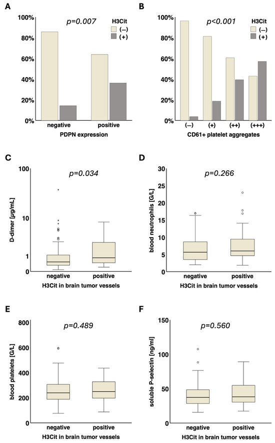 The presence of H3Cit in brain tumor vessels was significantly associated with intratumoral podoplanin expression (PDPN− vs. PDPN+: 14.3% (7/49) vs. 36.2% (38/105), p = 0.007) as well as with intravascular platelet clusters (CD61− vs. CD61+ vs. CD61++ vs. CD61+++: 3.7% (1/27) vs. 18.6% (11/59) vs. 39.4% (13/33) vs. 57.1% (20/35), p < 0.001). Moreover, H3Cit+ brain tumor vessels were significantly associated with D-dimer levels in the blood (H3Cit− vs. H3Cit+, median [Q1–Q3]: 0.53 [0.32–1.10] vs. 0.84 [0.46–2.75] µg/mL, p = 0.034). No significant association of H3Cit+ tumor vessels with blood platelets (H3Cit− vs. H3Cit+, median [Q1–Q3]: 239 [187–309] vs. 249 [197–327] G/L, p = 0.489), soluble P-selectin (H3Cit− vs. H3Cit+, median [Q1–Q3]: 37.3 [28.4–48.6] vs. 38.2 [30.2–55.3] ng/mL, p = 0.560), blood neutrophils (H3Cit− vs. H3Cit+, median [Q1–Q3]: 5.6 [3.5–8.7] vs. 6.0 [4.6–9.5] G/L, p = 0.266) and leukocytes (H3Cit− vs. H3Cit+, median [Q1–Q3]: 7.7 [5.6–10.8] vs. 8.1 [6.5–11.7] G/L, p = 0.276) was found (Figure 2).