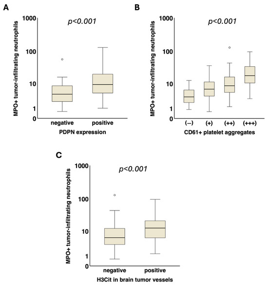A significant association of tumor-infiltrating MPO+ neutrophils with intratumoral podoplanin expression (PDPN− vs. PDPN +, median [Q1–Q3]: 4.3 [2.2–8.5] vs. 9.2 [4.7–19.9] cells/mm2, p < 0.001) as well as with intravascular platelet clusters (CD61− vs. CD61+ vs. CD61++ vs. CD61+++, median [Q1–Q3]: 3.4 [1.8–6.2] vs. 6.5 [3.7–11.5] vs. 8.5 [4.7–17.5] vs. 17.9 [8.3–36.3] cells/mm2, p < 0.001) was detected (Figure 3).