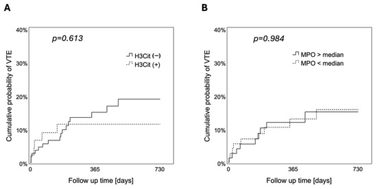 Cumulative probability of VTE according to the presence of NETs in brain tumor vessels and tumor-infiltrating neutrophils. During a 2-year follow-up, neither the presence of (A) H3Cit in brain tumor vessels (log-rank, p = 0.613) nor (B) tumor-infiltrating MPO+ neutrophils (high vs. low, cutoff: median = 7.5 cells/mm2) (log-rank, p = 0.984) were associated with the risk to develop VTE. VTE, venous thromboembolism. NETs, neutrophil extracellular traps. H3Cit, citrullinated histone H3. MPO, myeloperoxidase.