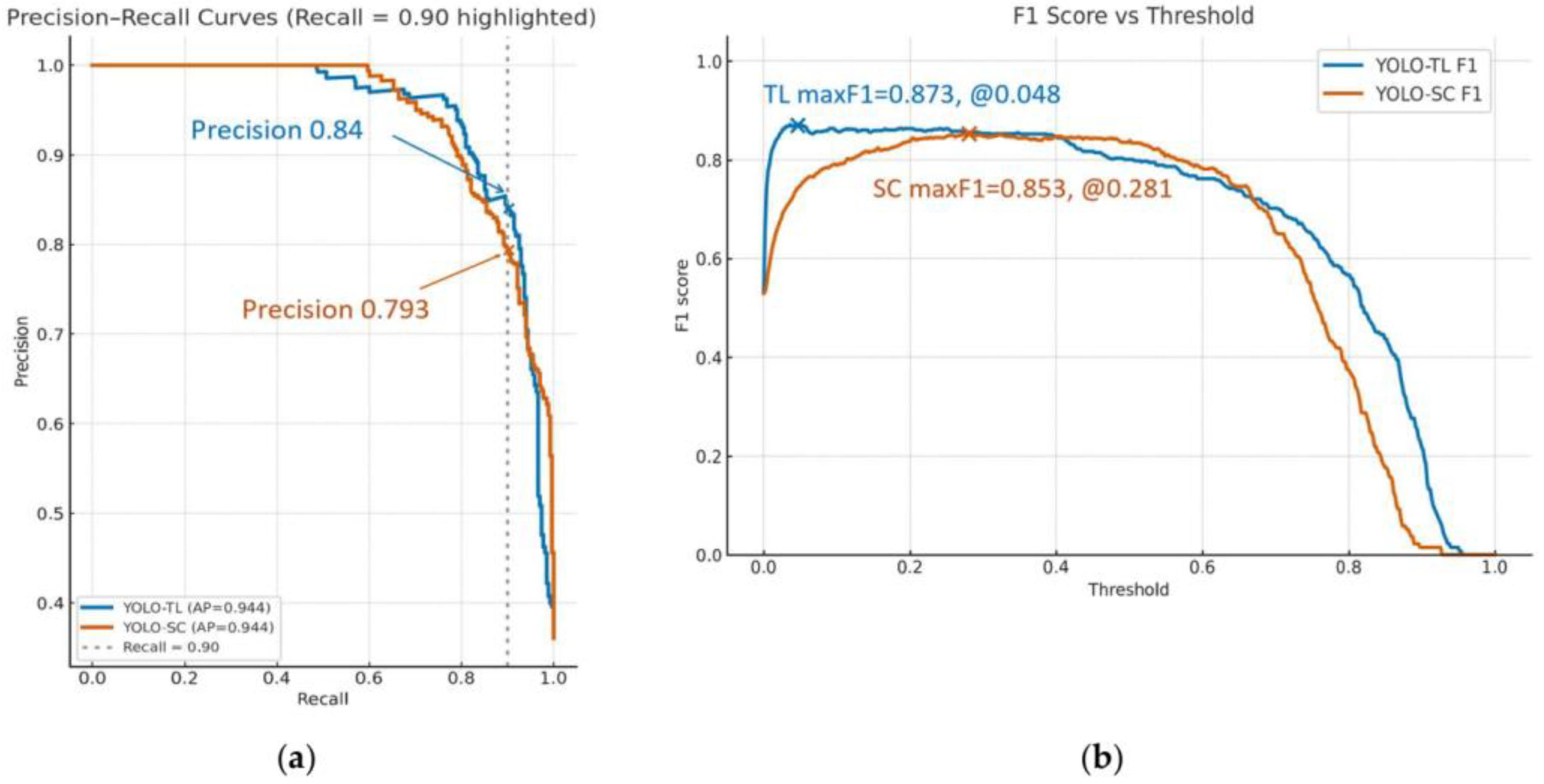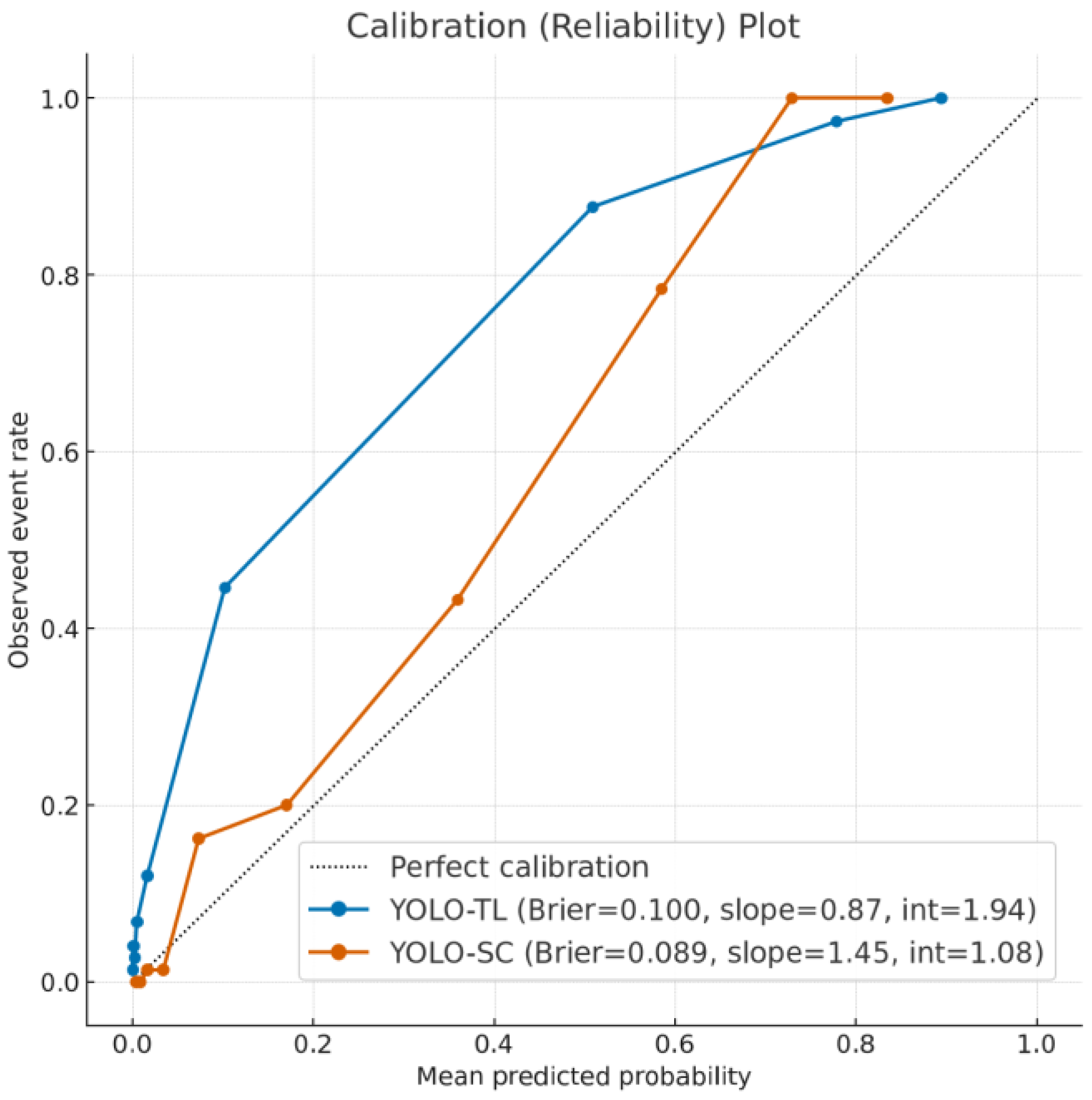 High Sensitivity (≥0.90) | YOLO-TL | 0.0413 | 0.903 (0.868–0.935) | 0.903 (0.873–0.929) | 0.840 (0.805–0.872) | 0.943 (0.918–0.963) | 46 | 26 |