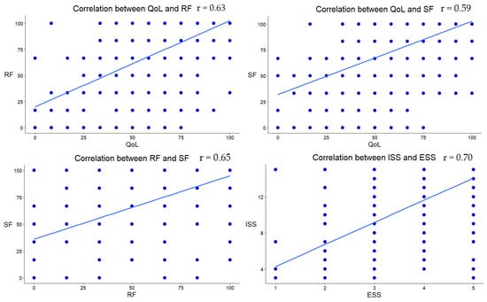 To analyze the association of social variables with global health status/QoL, a correlation matrix using Pearson correlation was generated for all variables of interest (Table 3). Most correlations were small (|r| < 0.30), although a higher correlation was observed between some variables: SF and RF (r = 0.65, p < 0.001), QL and SF (r = 0.59, p < 0.001), QL and RF (r = 0.63, p < 0.001) and ISS and ESS (r = 0.70, p < 0.001) (Figure 2). Despite several correlations reaching statistical significance, the effect sizes indicated weak associations overall. The correlations among the predictors were well below levels of concern for multicollinearity (r < 0.80), and therefore all variables were retained for subsequent analyses.