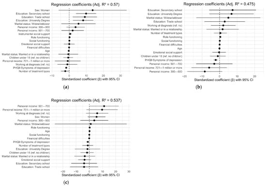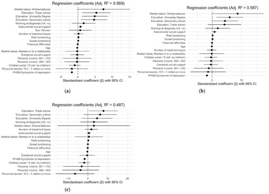 The forest plots illustrate the results from the regression analysis from Table 5. The following panels show (a) regression analysis, group: breast cancer survivors; (b) regression analysis, group: prostate cancer survivors; (c) regression analysis, group: colorectal cancer survivors.