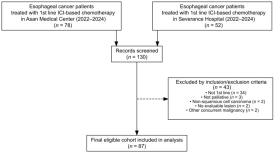 A total of 131 esophageal cancer patients who received ICI-based chemotherapy at Asan Medical Center (n = 78) or Severance Hospital (n = 52) between 2022 and 2024 were screened. After applying the eligibility criteria and data cleaning, 87 patients were included in the final analysis (Figure 1). The median age was 62 years (range, 42–87), and 16.1% of patients had an ECOG performance status of ≥2. Most patients (81.6%) had metastatic disease at baseline, and 43.7% had distant metastases involving two or more organs. The most frequent metastatic sites were distant lymph nodes (58.6%), lungs (33.3%), and liver (26.4%) (Table 1).