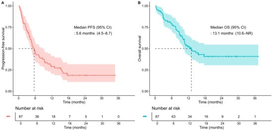 The median PFS was 5.6 months (95% CI, 4.5–8.7), with 6-month and 1-year PFS rates of 46.7% (95% CI, 36.9–58.9) and 29.0% (95% CI, 20.4–41.2), respectively (Figure 2A). The median OS was 13.1 months (95% CI, 10.6–not reached), with 6-month and 1-year OS rates of 78.7% (95% CI, 70.5–88.0) and 52.1% (95% CI, 42.0–64.6), respectively (Figure 2B).