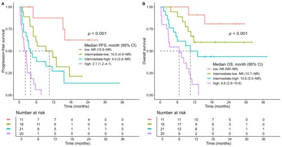 Kaplan–Meier curves for the total study population stratified by risk groups. (A) progression-free survival (PFS); (B) overall survival (OS). Risk groups were defined as follows: low-risk (score 0), intermediate–low-risk (score 1), intermediate–high-risk (score 2), and high-risk (score 3–5). p values were calculated using the log-rank test. Tick marks indicate censored observations. Dashed lines denote the median survival time where the survival probability reaches .0.5. CI, confidence interval; NR, not reached.