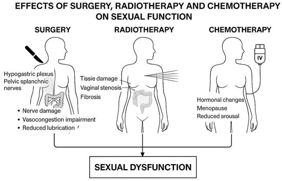 Sexual dysfunction after treatment for rectal and anal cancers can manifest as decreased libido, vaginal dryness, dyspareunia, difficulties with arousal or orgasm, and sexual avoidance [3]. Contributing factors include anatomical and neurological damage from surgery, side effects of pelvic radiotherapy, hormone alterations induced by chemotherapy (Figure 1), and psychological factors such as anxiety, depression, and altered body image.