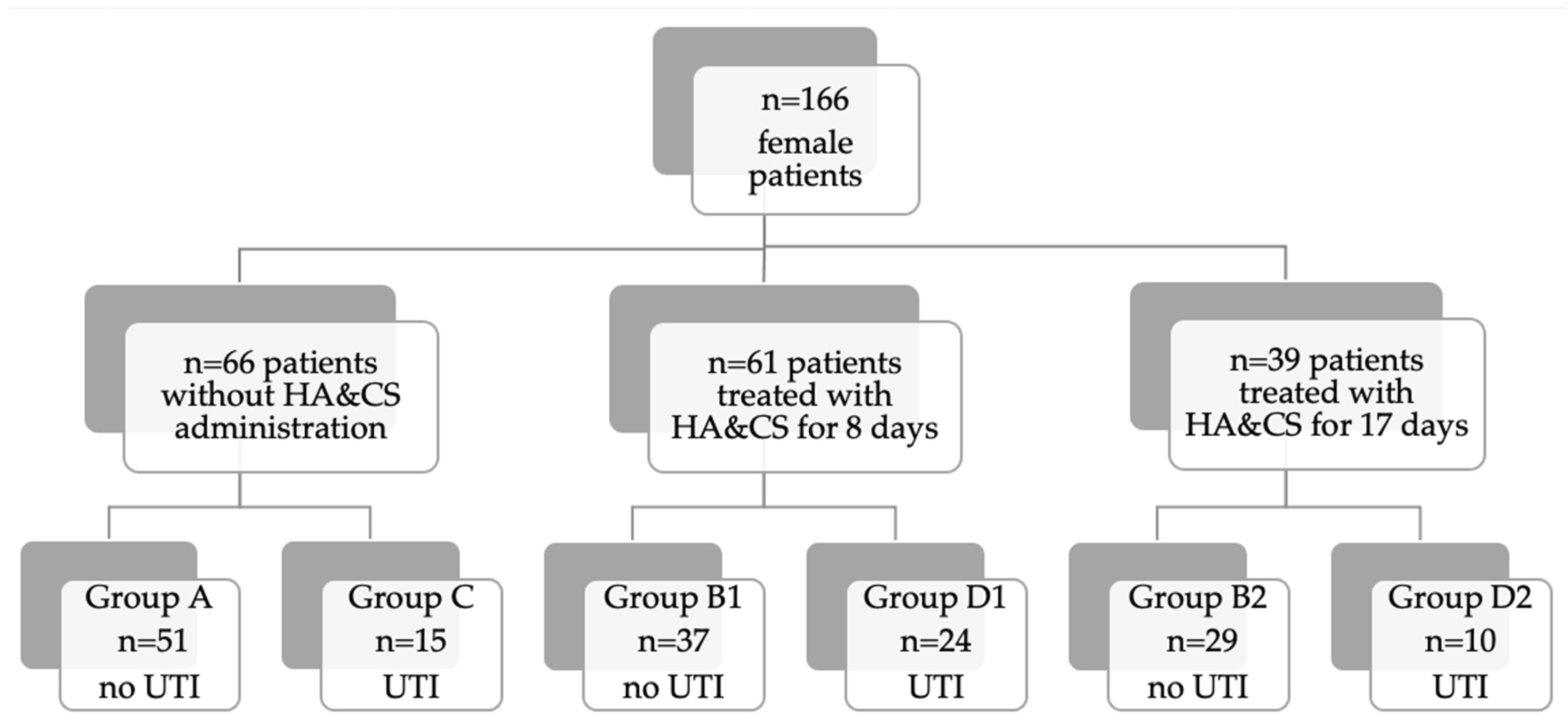 Moreover, we analyzed three further groups: groups A + C (n = 66), groups B1 + D1 (n = 61) and groups B2 + D2 (n = 39) to assess the differences in UTI development, according to the treatment with HA&CS and its duration.