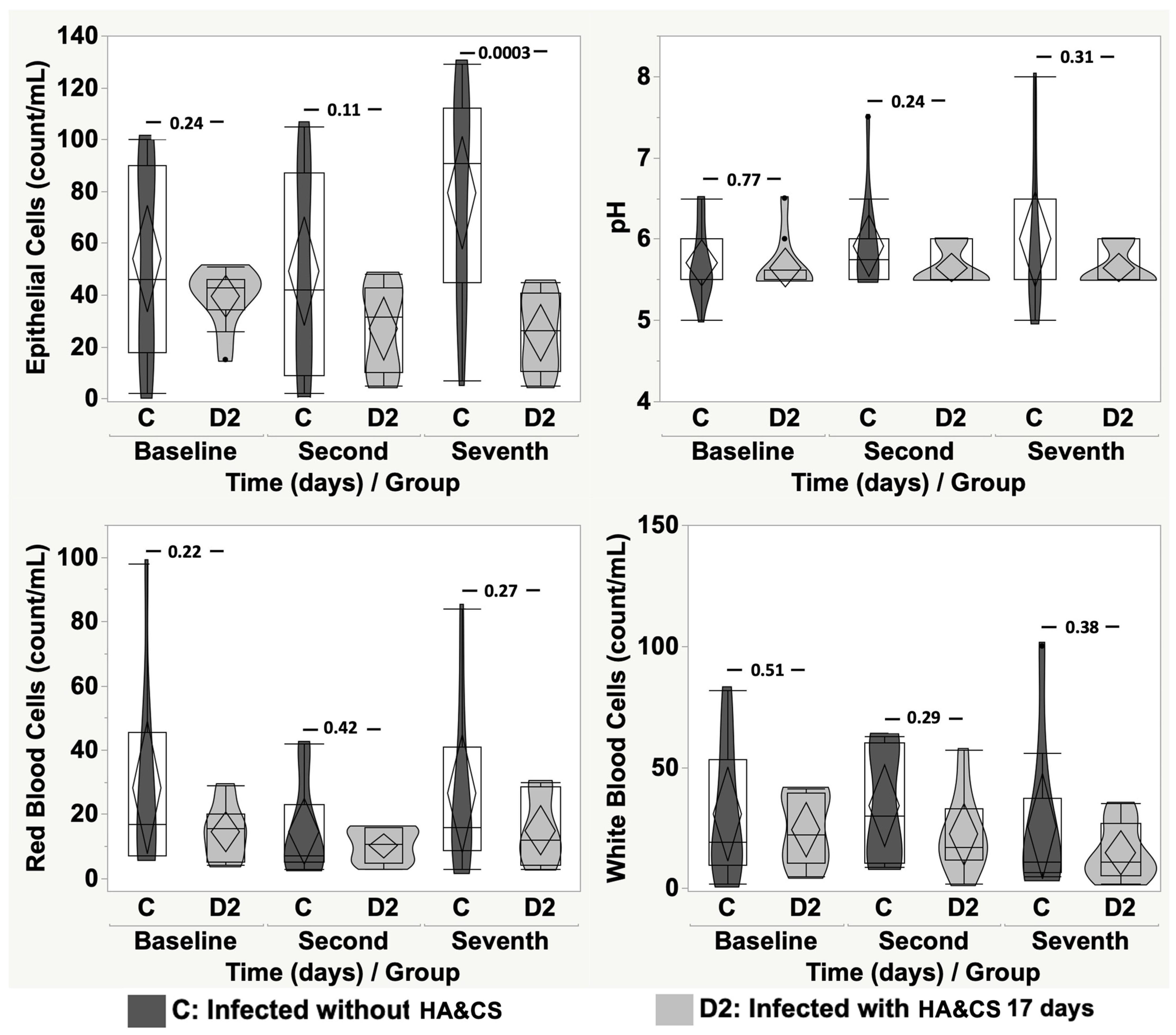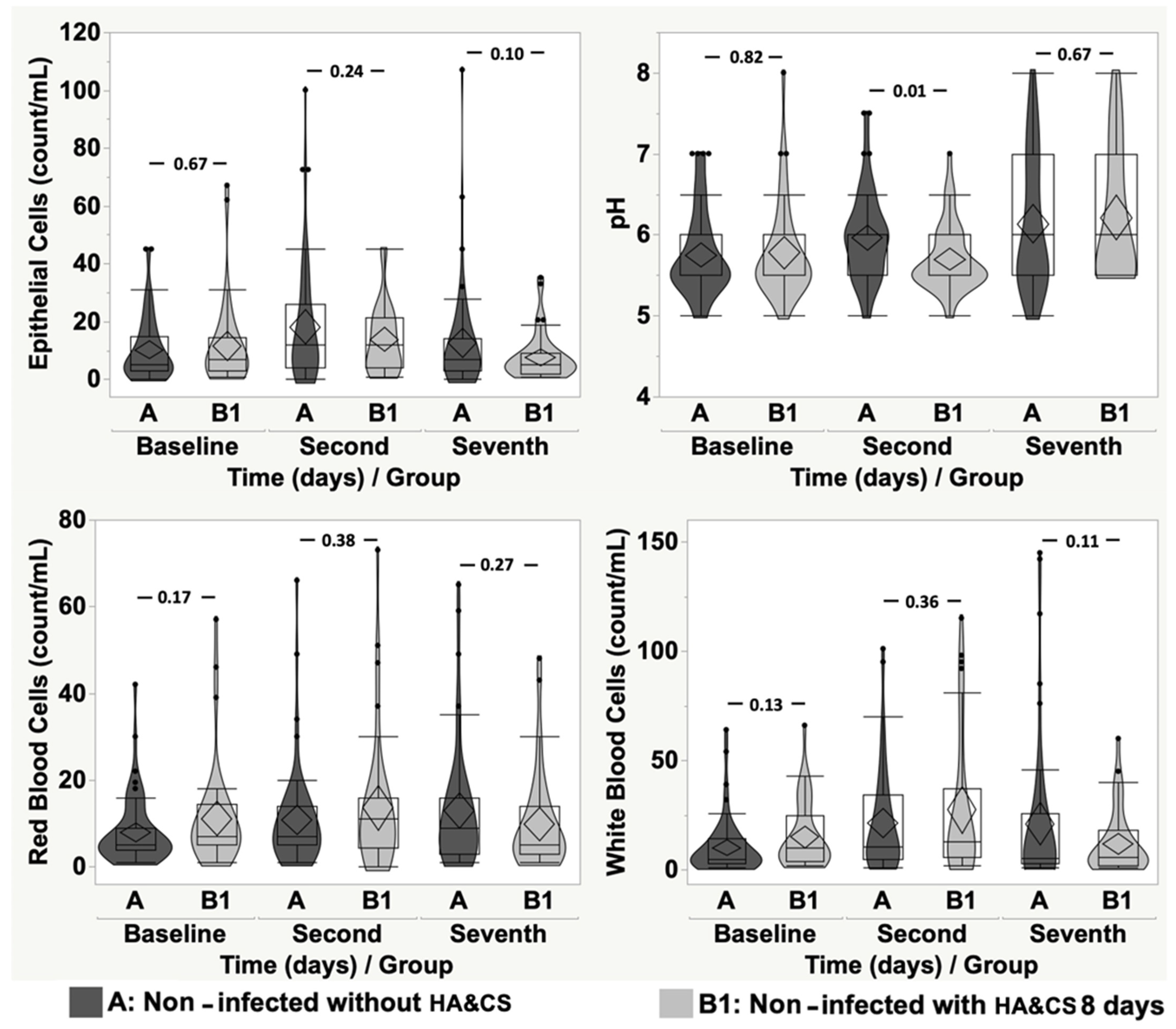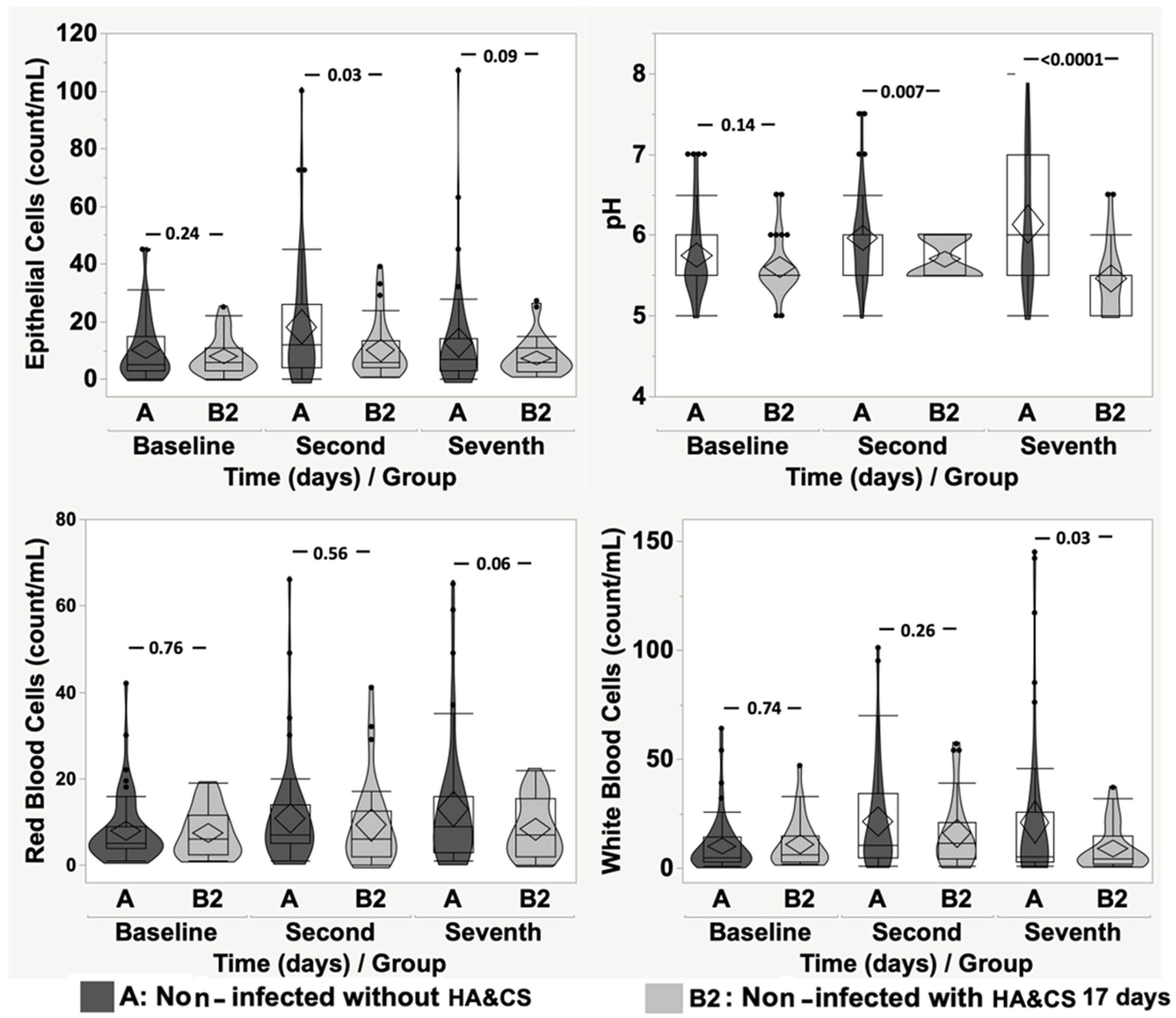 Bacteria: Baseline vs. Baseline, p = 0.99; Second Day vs. Second Day, p = 0.72; Seventh Day vs. Seventh Day, p = 0.99. Epithelial Cells: Baseline vs. Baseline, p = 0.97; Second Day vs. Second Day, p = 0.61; Seventh Day vs. Seventh Day, p = 0.95. pH: Baseline vs. Baseline, p = 0.66; Second Day vs. Second Day, p = 0.31; Seventh Day vs. Seventh Day, p = 0.99. Red Blood Cells: Baseline vs. Baseline, p = 0.25; Second Day vs. Second Day, p = 0.48; Seventh Day vs. Seventh Day, p = 0.45. White Blood Cells: Baseline vs. Baseline, p = 0.29; Second Day vs. Second Day, p = 0.23; Seventh Day vs. Seventh Day, p = 0.88.