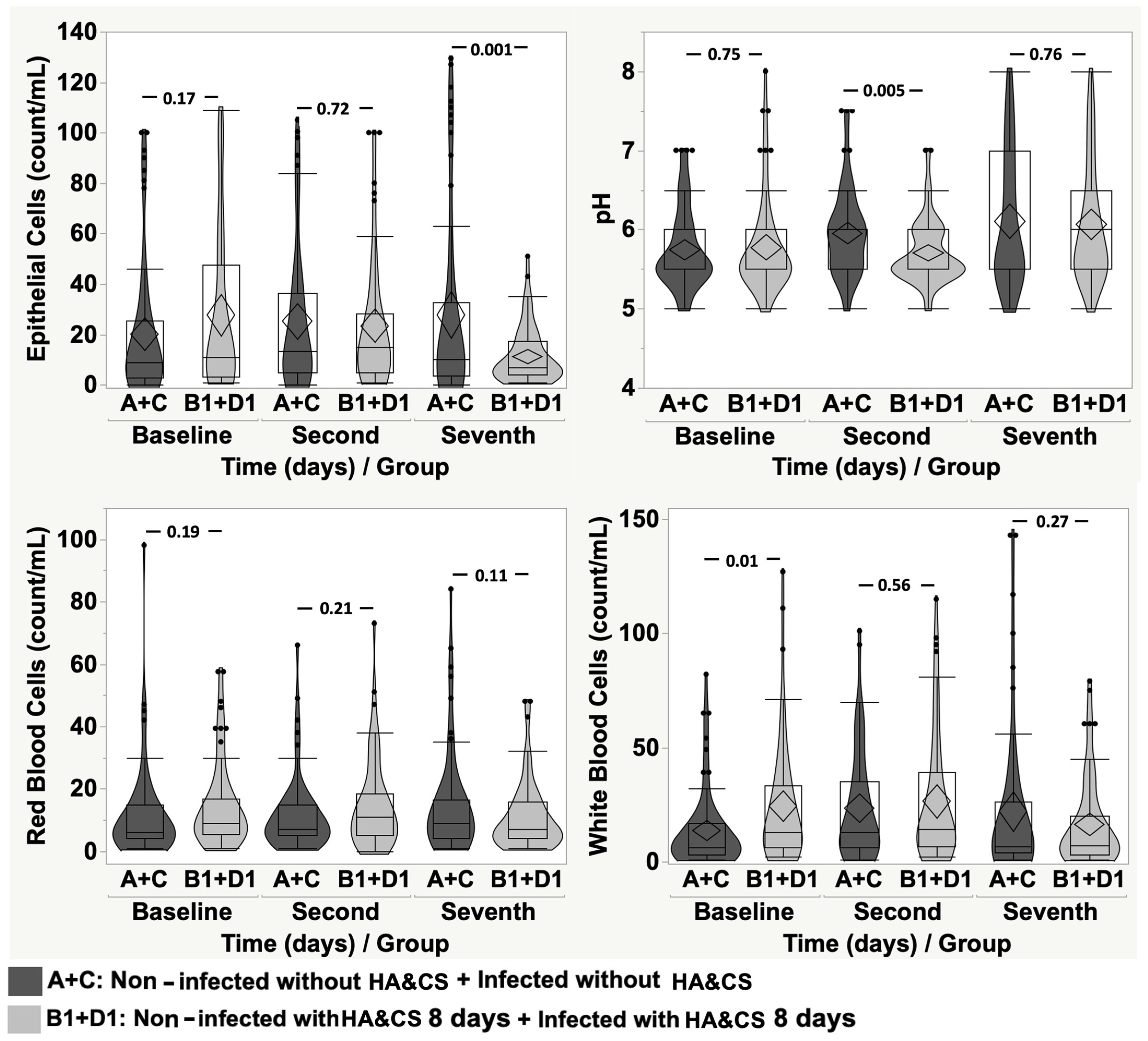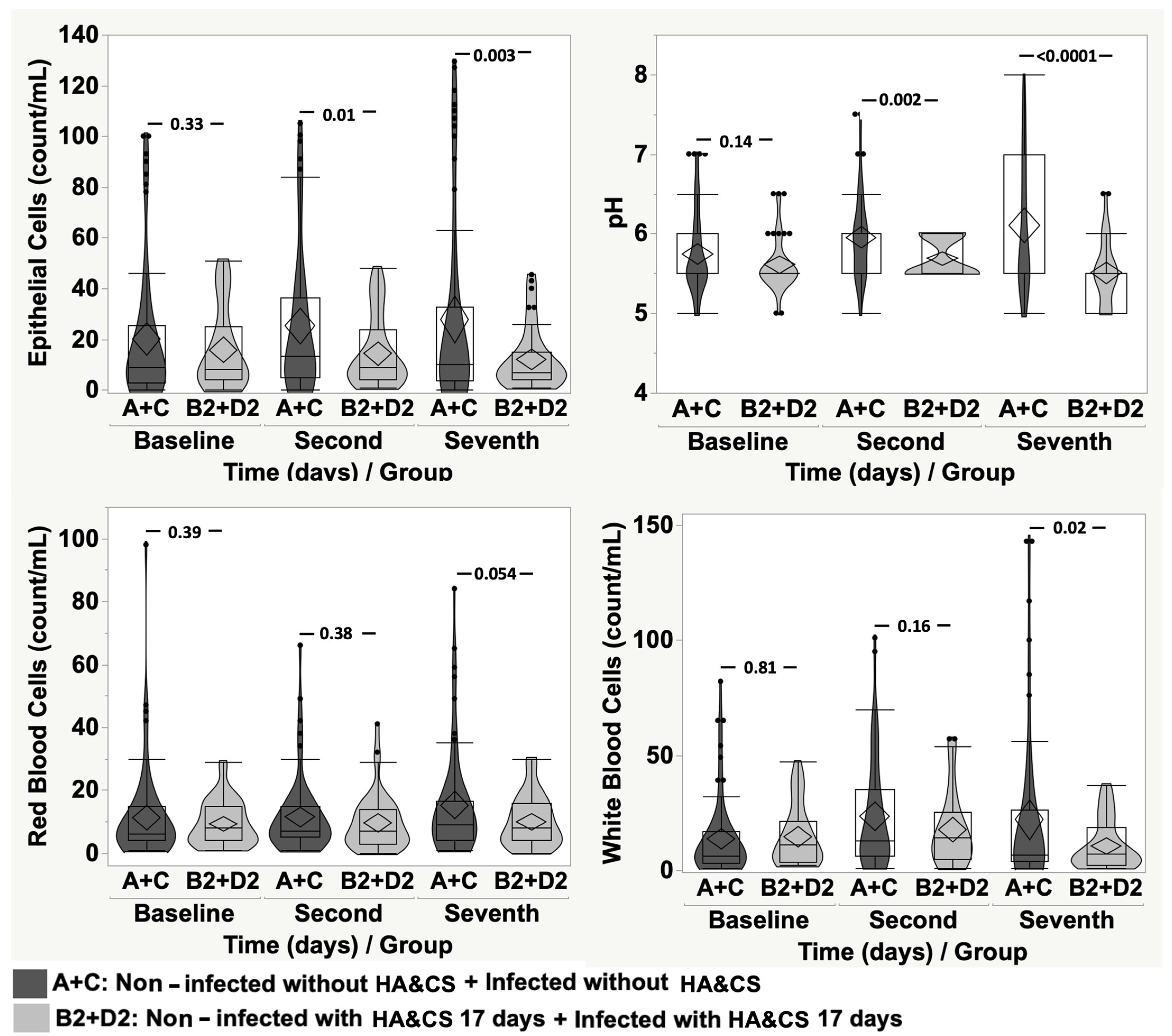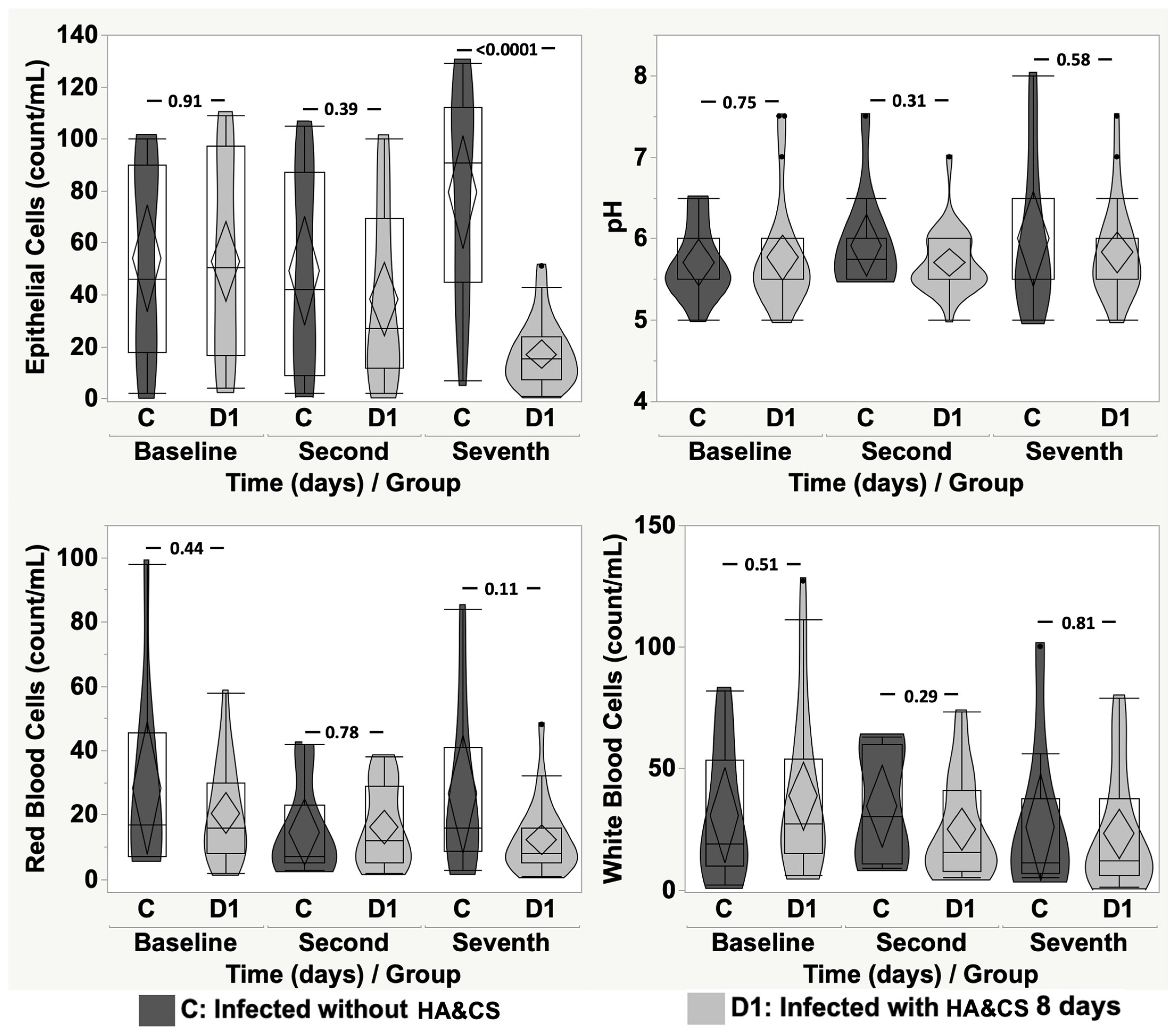 Bacteria: Baseline vs. Baseline, p = 0.99; Second Day vs. Second Day, p = 0.72; Seventh Day vs. Seventh Day, p = 0.99. Epithelial Cells: Baseline vs. Baseline, p = 0.97; Second Day vs. Second Day, p = 0.61; Seventh Day vs. Seventh Day, p = 0.95. pH: Baseline vs. Baseline, p = 0.66; Second Day vs. Second Day, p = 0.31; Seventh Day vs. Seventh Day, p = 0.99. Red Blood Cells: Baseline vs. Baseline, p = 0.25; Second Day vs. Second Day, p = 0.48; Seventh Day vs. Seventh Day, p = 0.45. White Blood Cells: Baseline vs. Baseline, p = 0.29; Second Day vs. Second Day, p = 0.23; Seventh Day vs. Seventh Day, p = 0.88.