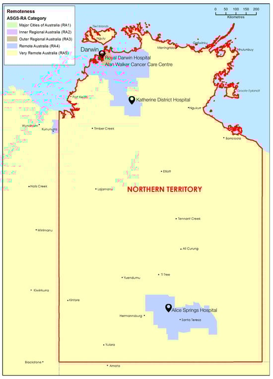 - Northern Territory (NT) Primary Health Network (PHN) Map—Australian Statistical Geography Standard (ASGS) Remoteness area. Department of Health Disability and Ageing: Canberra, Australia, 2025. Available online: https://www.health.gov.au/sites/default/files/documents/2021/03/northern-territory-nt-primary-health-network-phn-map-australian-statistical-geography-standard-asgs-remoteness-area.png (accessed on 23 September 2025).