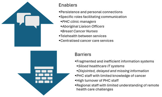 Analysis of the interviews revealed several enablers and barriers to communication between rural and remote PHC clinics and regional and remote hospital services about the Aboriginal cancer patients they cared for (Figure 2).