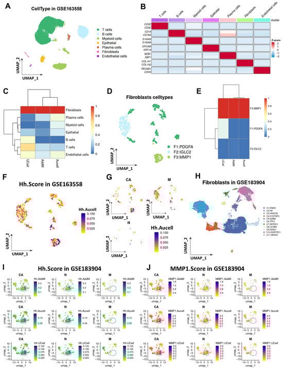 Activation levels of the Hh pathway in different cell subsets within the gastric cancer tumor microenvironment. (A) UMAP shows the distribution of seven cell types in the GSE163558 dataset. (B) Marker genes of each cell type. (C) Heatmap presenting the activation levels of the Hh gene set in the seven cell subsets based on three enrichment analysis methods (UCell, AddModuleScore, and Aucell). (D) UMAP shows the distribution of three subsets of fibroblasts after secondary clustering. (E) Heatmap presenting the activation levels of the Hh gene set in the three fibroblast subsets based on three enrichment analysis methods (UCell, AddModuleScore, and Aucell). (F) UMAP shows the activation level of the Hh gene set in fibroblasts. (G) UMAP shows the activation status of the Hh pathway in fibroblast populations from samples at different lesion stages (carcinoma in situ, paracancerous tissues, and metastatic tumors). (H) UMAP shows the subset distribution of fibroblasts from samples at different lesion stages (carcinoma in situ, paracancerous tissues, and metastatic tumors) in the GSE183904 dataset after secondary dimensionality reduction and clustering. (I) UMAP shows the activation status of the Hh gene set in fibroblast populations from samples at different lesion stages in the GSE183904 dataset. (J) UMAP shows the activation status of the top 50 differentially expressed genes in the MMP1 + FIB subset among fibroblast populations from samples at different lesion stages in the GSE183904 dataset. CA, gastric cancer; N, normal gastric tissue; M, metastatic tumor.