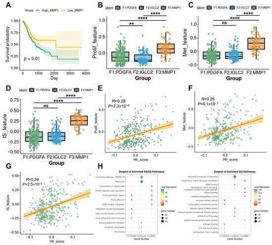 Association of MMP1 + FIB with malignant progression of gastric cancer. (A) Survival analysis curves of patients in the High_MMP1 and Low_MMP1 groups. (B–D) Inter-group comparison analysis showing differences among fibroblast subsets in terms of tumor proliferation, metastasis, and immunosuppression. (E–G) Correlation analysis revealing associations between the Hh score and tumor proliferation, metastasis, and immunosuppression. (H) Results of KEGG and GO functional annotation analyses for each fibroblast subset. Hh_score, gsva enrichment score of the Hedgehog signaling pathway gene set; Prolif_feature, gsva enrichment score of the tumor proliferation gene set; Met_feature, gsva enrichment score of the tumor metastasis gene set; IS_feature, gsva enrichment score of the immunosuppressive gene set. ns, p ≥ 0.05; ** p ≤ 0.01; **** p ≤ 0.0001.