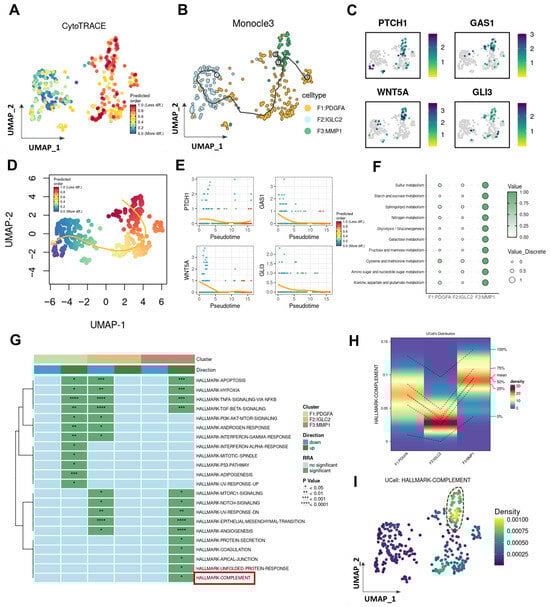 Given that MMP1 + FIB is the fibroblast subset with the highest activation level of the Hh pathway, this study further investigated its differentiation trajectory, bioinformatics characteristics, and Hh activation status. CytoTRACE analysis revealed that MMP1 + FIB exhibits a low degree of differentiation, which indicates that this cell subset possesses strong stemness characteristics and a relatively complex gene expression pattern, and it is typically found in the initial stage of the cell differentiation process. Therefore, in the Monocle3 pseudotime analysis, we designated MMP1 + FIB as the starting point of differentiation, and we found that the expression levels of Hh-related genes gradually decreased as cells differentiated (Figure 3B,C, Supplementary Figure S4A–E). To further validate the above conclusion, this study employed the slingshot tool to infer the lineage differentiation structure and sequence of fibroblasts. The results obtained were consistent with the aforementioned findings: MMP1 + FIB localizes at the initial stage of the cell differentiation trajectory, and as cells differentiate, the expression levels of Hh-related genes also showed a gradual decreasing trend (Figure 3D,E). We further explored the bioinformatics characteristics of MMP1 + FIB. Results of the ScMetabolism analysis based on the KEGG database demonstrated that the main metabolic patterns of MMP1 + FIB include glucose metabolism, starch and sucrose metabolism, butyrate metabolism, nitrogen metabolism, glycolysis/gluconeogenesis, galactose metabolism, fructose and mannose metabolism, and other metabolic pathways (Figure 3F). Furthermore, results of the irGSEA analysis showed that a total of 14 signature gene sets in MMP1 + FIB exhibited an upregulated trend, among which 5 gene sets (e.g., the Complement system) were specifically activated in this subset (Figure 3G–I).