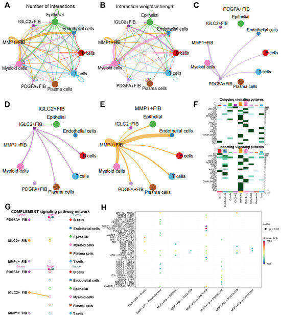 CellChat reveals cell–cell communication roles of MMP1 + FIB in the gastric cancer TME. (A,B) Circos plots depict the number and strength of the interactions among different cell types. Thicker lines indicate greater interaction numbers and stronger intensity between cell types. (C–E) Cell–cell communication networks for MMP1 + FIB, PDGFA + FIB, and IGLC2 + FIB. (F) Heatmap showing the relative strength of each signaling pathway network per cluster, including incoming and outgoing signaling. Color gradients reflect scaled interaction strength. (G) Hierarchy plot illustrating the signaling cascade of the COMPLEMENT signaling pathway network. (H) Bubble plot highlighting the dominant signaling pathways in MMP1 + FIB. Each dot represents a ligand–receptor pair, with the size determined by the pathway-enrichment p-value and color indicating the communication probability. FIB, fibroblast.