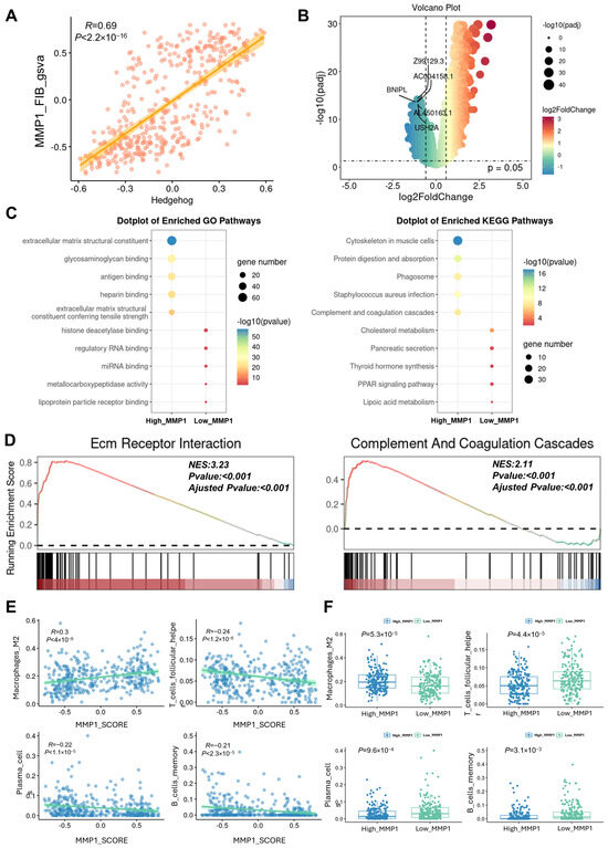 Validation of single-cell sequencing results by bulk RNA-Seq. (A) Correlation scatter plot showing the association between the Hh activation level and the MMP1 + FIB infiltration level in patients. (B) Volcano plot of the DEGs between the High_MMP1 group and the Low_MMP1 group. (C) Results of the GO and KEGG functional annotation analyses for the High_MMP1 group and the Low_MMP1 group. (D) GSEA enrichment analysis showing the activation status of the ECM–receptor interaction and complement and coagulation cascades. (E) Correlation between the MMP1 + FIB infiltration level and the infiltration levels of M2 macrophages, T cells, plasma cells, and other immune cells in patients. (F) Box plot presenting the differences in the infiltration levels of M2 macrophages, T cells, plasma cells, and other immune cells between the High_MMP1 group and the Low_MMP1 group. Hedgehog, gsva enrichment score of the Hedgehog signaling pathway gene set; High_MMP1, patients with high GSVA scores for MMP1 + FIB-related characteristic genes; Low_MMP1, patients with low GSVA scores for MMP1 + FIB-related characteristic genes.