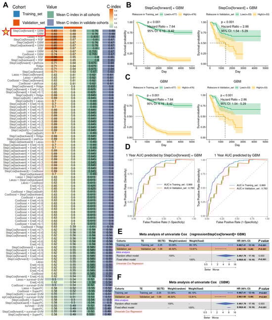 Construction of the MMP1 + FIB model and validation of its efficacy in predicting survival outcomes. (A) Using 10 comprehensive computational frameworks (StepCox, GBM, Lasso, RSF, plsRcox, Ridge, Enet, CoxBoost, survival-SVM, SuperPC), 101 machine learning algorithm combinations were generated. The C-index of each model was calculated in the training and validation cohorts to evaluate predictive performance. (B) Kaplan–Meier curves showed the association between the risk scores calculated by the StepCox[forward] + GBM combined model and patient outcomes in both the training and validation cohorts. (C) Kaplan–Meier curves demonstrated the relationship between the risk scores derived from the GBM model and patient outcomes in the training and validation cohorts. (D) ROC curves evaluated the 1-year survival area under the curve (AUC) performance of the StepCox[forward] + GBM and GBM models. (E) Meta-analysis of the univariate Cox regression for the MMP1 + FIB-related signature genes and survival time under the StepCox[forward] + GBM model. (F) Meta-analysis of the univariate Cox regression for the MMP1 + FIB-related signature genes and survival time in the GBM model.