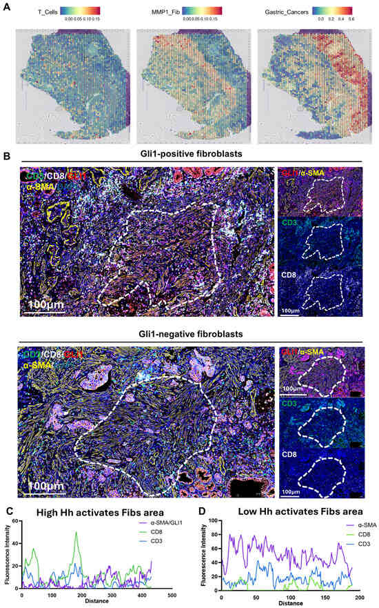 Observation of the spatial distribution of T cells, Hh-activated fibroblasts, and gastric cancer cells via spatial transcriptomics and mIHC. (A) Spatial transcriptomics data of T cells, MMP1 + FIB, and gastric cancer cells in gastric cancer pathological sections. (B) mIHC staining of 3 gastric cancer tissue sections. Cell nuclei: DAPI (blue fluorescence). T cells: CD3 (green fluorescence), CD8 (white fluorescence). Fibroblasts: α-SMA (yellow fluorescence). Molecular marker for Hedgehog signaling pathway activation: GLI1 (red fluorescence). (C) Fluorescence intensity distribution curve showing the spatial distribution relationship between GLI1-positive fibroblasts and T cells. (D) Fluorescence intensity distribution curve showing the spatial distribution relationship between GLI1-negative fibroblasts and T cells. FIB, fibroblast.