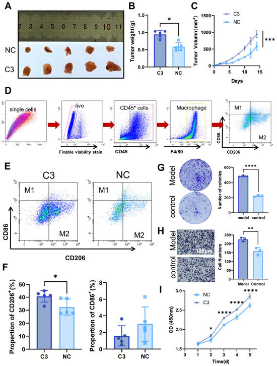 In vivo and in vitro experiments reveal that high Hh.score fibroblasts affect gastric cancer progression by secreting C3. Nude mice subcutaneously injected with C3 recombinant protein and MKN45 gastric cancer cells were used to assess (A) tumor growth and (B) tumor weight. (C) Tumor volume curves in xenograft models (n = 5 per group). (D) Flow sorting strategy. (E,F) Flow cytometry analysis of M1 and M2 macrophage proportions in tumor tissues. (G–I) Effects of macrophage-conditioned medium stimulated with C3 on MFC gastric cancer cells: (G) colony formation assay for clonogenic capacity, (H) Transwell chamber assay for invasion ability, and (I) CCK-8 assay for proliferation capacity. C3, C3 recombinant protein intervention group; NC, control group. * p ≤ 0.05; ** p ≤ 0.01; *** p ≤ 0.001; **** p ≤ 0.0001.