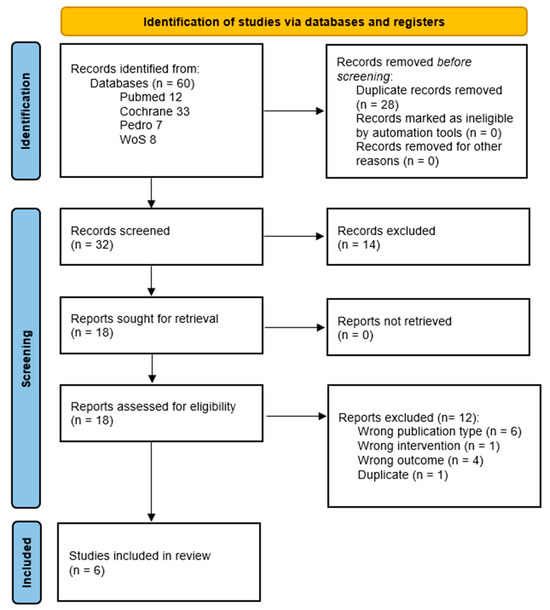 The final database search was conducted on 8 November 2024, yielding a total of 60 references. After removal of duplicates, 32 unique articles remained for screening based on titles and abstracts. Of these, 10 full-text articles were retrieved for detailed eligibility assessment. Following application of the predefined inclusion and exclusion criteria, six articles met eligibility criteria and were included in the systematic review [18,19,20,21,22,23].