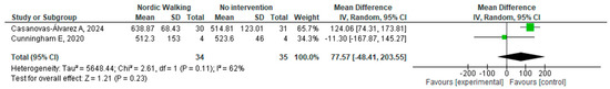 Fields et al. [20] reported categorical changes in physical activity: 39% (7/18) of participants in the NW group reported increased vigorous physical activity, with no change observed in walking activity. In the control group, 45% (9/20) reported an increase in walking activity, and 15% (3/20) reported an increase in vigorous activity.