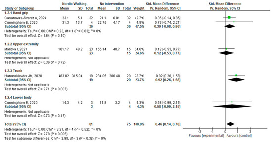 Similarly, the pooled effect size for muscle (Std. MD: 0.46) represents a moderate effect, reinforcing NW’s potential to support muscular conditioning in people with cancer. These findings are consistent with evidence from older adults and individuals with cardiac or metabolic conditions [27,28], where the combination of upper-body engagement and increased energy expenditure has been shown to enhance both strength and activity behavior.