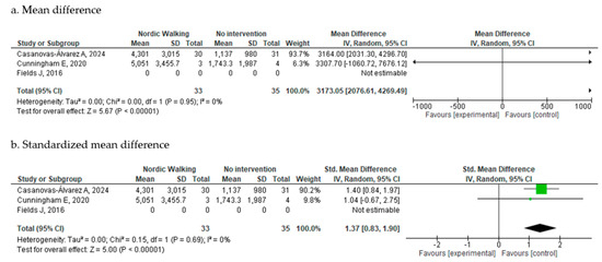 The meta-analysis of the remaining two studies, comprising 67 participants, demonstrated a statistically significant improvement in physical activity levels as measured by the International Physical Activity Questionnaire (IPAQ) (MD = 3173.05 MET-min/week; 95% CI: 2076.61 to 4269.49; I2 = 0%) (Figure 4a). Due to the wide range of values observed, an additional analysis using Std.MD was performed for improved visualization and interpretability (Figure 4b), which yielded consistent results. Findings remained unchanged when analyzed using a fixed-effects model (Supplementary S3c).