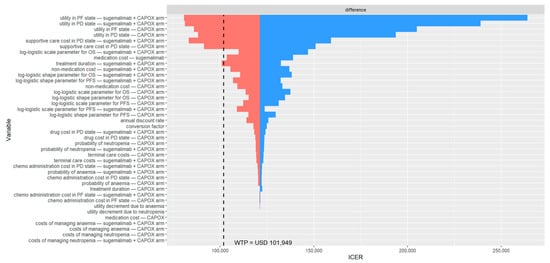 Deterministic sensitivity analysis results among patients with PD-L1 CPS ≥ 10. The black dashed line indicates the willingness to pay threshold of USD 101,949 per QALY gained. CAPOX, a combination of oxaliplatin and capecitabine; chemo, chemotherapy; ICER, incremental cost-effectiveness ratio; OS, overall survival; PD, progressed disease; PF, progression-free; PFS, progression-free survival; USD, United States dollar; WTP, willingness-to-pay.