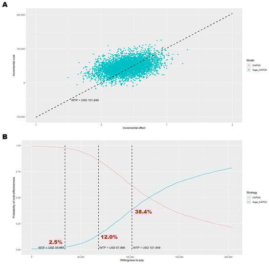 Probabilistic sensitivity analysis results among patients with PD-L1 CPS ≥ 10. (A) Outcomes over 5000 Monte Carlo simulations on the cost-effectiveness plane; (B) cost-effectiveness acceptance curve. In panel (A), the black dashed line represents the willingness-to-pay threshold of USD 101,949 per QALY gained. In panel (B), the dashed lines indicate willingness-to-pay thresholds of USD 33,983, USD 67,966, and USD 101,949 per QALY gained. CAPOX, a combination of oxaliplatin and capecitabine; Suge_CAPOX, sugemalimab plus CAPOX; WTP, willingness-to-pay.