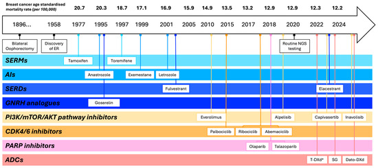 Timeline illustrating the evolution of FDA-approved endocrine and targeted therapies, categorised by mechanism of action or target, for advanced ER-positive breast cancer, alongside corresponding reductions in breast cancer-related mortality in Australia over time. Ref. [12] * Approved for HER2-low advanced breast cancer. Abbreviations: ADCs: antibody–drug conjugates; AIs: aromatase inhibitors; AKT: Protein kinase B; CDK4/6: cyclin-dependent kinase 4/6; Dato-DXd: Datopotamab deruxtecan; ER: oestrogen receptor; GNRH: gonadotropin-releasing hormone; mTOR: mechanistic target of rapamycin; NGS: next-generation sequencing; PARP: poly (ADP-ribose) polymerase; PI3K: phosphoinositide 3-kinase; SERDs: selective oestrogen receptor degraders; SERMs: selective oestrogen receptor modulators; SG: Sacituzumab Govitecan; T-DXd: Trastuzumab Deruxtecan.