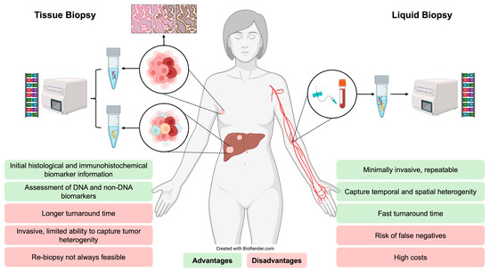 In this context, plasma-based ctDNA profiling offers a minimally invasive alternative that captures tumour heterogeneity and molecular evolution [48]. Cell-free DNA (cfDNA) is mainly released via apoptosis and necrosis, a proportion of which is derived from tumour cells (ctDNA) [10,49]. The ctDNA fraction varies from 0.01 to 0.1% in early-stage disease to 5 to 10% in advanced disease, influenced by tumour burden, proliferative rate and breast cancer subtype [10,49]. Detection methods include digital droplet polymerase chain reaction (ddPCR) for precise detection of known mutations or next-generation sequencing (NGS) for broad multi-gene profiling [10,37,49]. Liquid biopsy enables repeat, relatively non-invasive and real-time assessment and quantification of genomic alterations to capture intra-tumoural heterogeneity and clonal evolution, although it can be limited by false-negative results from low-shedding tumours [10,48,53]. Figure 4 summarises the advantages and limitations of tissue versus liquid biopsy for molecular profiling in ER-positive breast cancer.