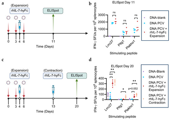 We subsequently administered rhIL-7-hyFc during the T cell expansion phase (day 4) or T cell contraction phase (day 13) to determine the optimal timing of administration. rhIL-7-hyFc (5 mg/kg) was administered subcutaneously on day 4 or day 13 after the start of the PCV (Figure 1a,c). rhIL-7-hyFc at 5 or 10 mg/kg is routinely used in mouse preclinical models with no known toxicity issues [30,31]. Additionally, rhIL-7-hyFc is well tolerated in patients in the range of 60–1200 µg/kg [32]. The dose level of 5 mg/kg rhIL-7-hyFc in mice is equivalent to 405 µg/kg in humans, which is a clinically relevant dose. ELISpot assays were performed on days 11 and 20 to measure neoantigen-specific T cell immunity. The administration of rhIL-7-hyFc on day 4 did not significantly enhance neoantigen-specific responses on day 11 compared to the PCV alone (Figure 1b). The addition of rhIL-7-hyFc to DNA PCV during the expansion or contraction phase enhanced T cell responses to the neoantigen Lrrc27 equally at day 20. Interestingly, only the administration of rhIL-7-hyFc during the contraction phase significantly increased responses to the neoantigens Pttg1 and Plekho1 at day 20 (Figure 1d). Thus, we determined the administration of rhIL-7-hyFc during the contraction phase to be optimal for enhancing durable PCV-induced neoantigen responses, even among relatively weak neoantigens: Pttg1 and Plekho1.