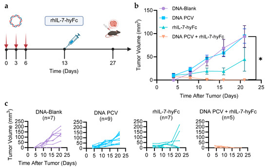 PCV in combination with rhIL-7-hyFc protects against tumor growth. (a) Mice were treated with the empty vector plasmid DNA or DNA PCV on days 0, 3, and 6, and 5 mg/kg rhIL-7-hyFc was administered subcutaneously on day 13. On day 27, 105 E0771 cells were inoculated subcutaneously into each mouse’s flank. The length (l) and width (w) of the tumor was measured every 4 days after tumor inoculation. The tumor volume for each group was calculated using the formula v = (l × w2)/2 and graphed as the average (b) or individually (c) for each group. The PCV in combination with rhIL-7-hyFc significantly reduced tumor growth compared to PCV alone (p = 0.0013). *: p ≤ 0.05.