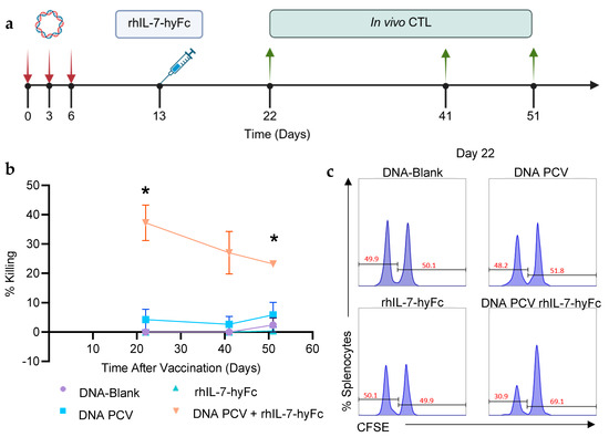 C57BL/6 mice were vaccinated with the neoantigen PCV on days 0, 3, and 6. rhIL-7-hyFc (5 mg/kg) was administered on day 13 as previously optimized (Figure 3a). Neoantigen-specific killing was measured through an in vivo killing assay using naïve splenocytes labeled at two CFSE concentrations. Cells labeled with the lower concentration of CFSE were pulsed with the minimal MHC class I-restricted peptides corresponding to the PTTG1, PLEKHO1, and Lrrc1 neoantigens. Cells labeled with the higher concentration of CFSE were not pulsed with peptide. At day 22, mice that received the PCV and rhIL-7-hyFc demonstrated 45% killing, compared to 7% killing in mice that received the PCV alone. The neoantigen-specific killing induced by the PCV in combination with rhIL-7-hyFc was durable, with 23% killing observed at day 51 (Figure 3b,c).