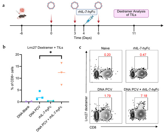 Combination of PCV and rhIL-7-hyFc increases neoantigen-specific TILs. (a) Here, 105 E0771 cells were inoculated subcutaneously into the flanks of mice and allowed to grow for 6 days, reaching a volume of approximately 50 mm3. Tumor-bearing mice (n = 10 total) were arbitrarily assigned to four treatment groups: DNA-Blank control (n = 2), DNA-PCV only (n = 3), rhIL-7-hyFc only (n = 2), and DNA PCV + rhIL-7-hyFc (n = 3). The PCV was administered on days 0, 3, and 6. rhIL-7-hyFc was given on day 4. Lrrc27 dextramer analysis of TILs was performed 11 days after the start of vaccination. (b) Combination of the PCV and rhIL-7-hyFc induced 12% of CD8+ TILs to be Lrrc27-dextramer-positive. The PCV alone only induced 2.5% of CD8+ TILs to be dextramer-positive. (c) Representative flow cytometry plots. *: p ≤ 0.05.
