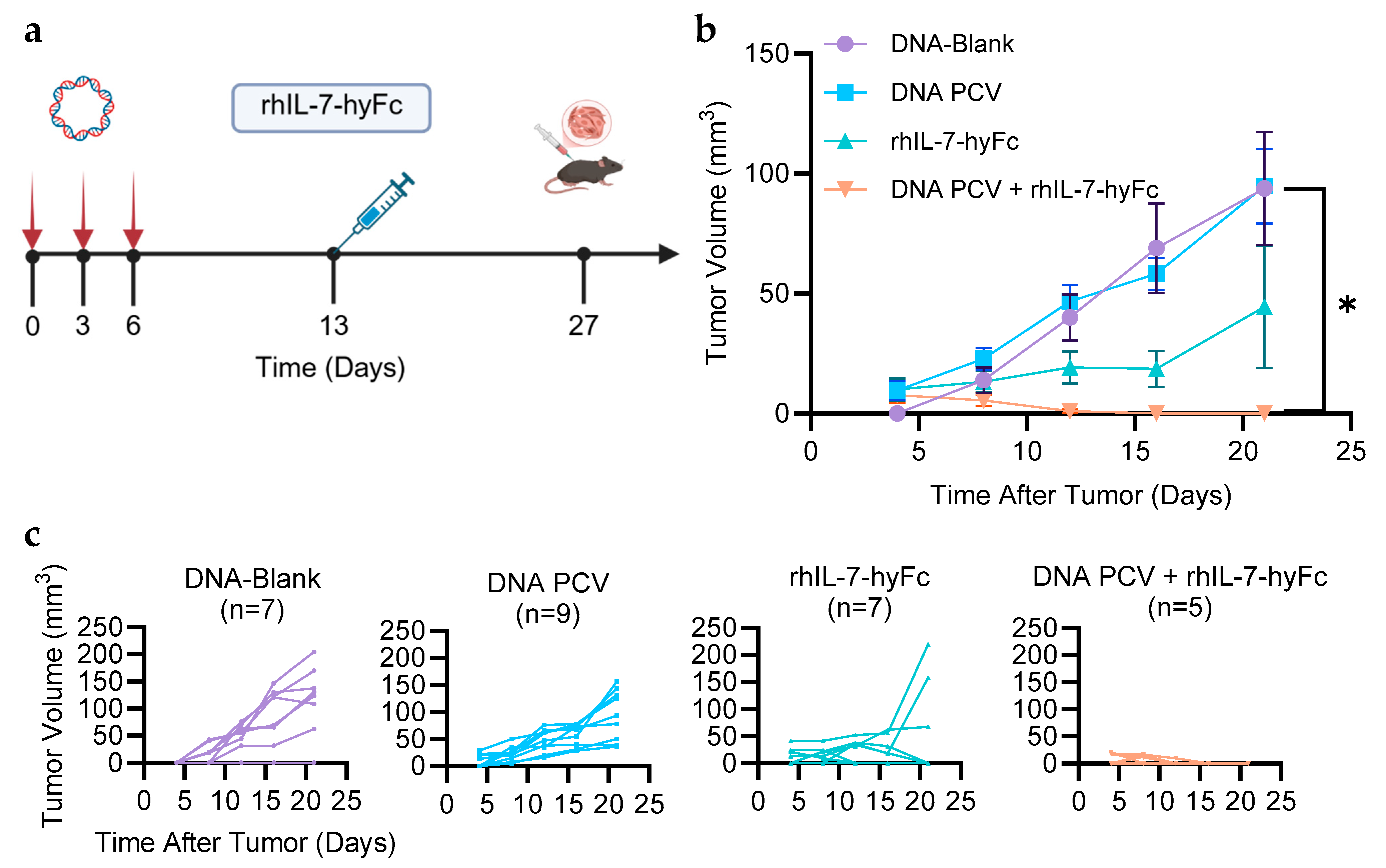 Figure 2. PCV in combination with rhIL-7-hyFc protects against tumor growth. (a) Mice were treated with the empty vector plasmid DNA or DNA PCV on days 0, 3, and 6, and 5 mg/kg rhIL-7-hyFc was administered subcutaneously on day 13. On day 27, 105 E0771 cells were inoculated subcutaneously into each mouse’s flank. The length (l) and width (w) of the tumor was measured every 4 days after tumor inoculation. The tumor volume for each group was calculated using the formula v = (l × w2)/2 and graphed as the average (b) or individually (c) for each group. The PCV in combination with rhIL-7-hyFc significantly reduced tumor growth compared to PCV alone (p = 0.0013). *: p ≤ 0.05.